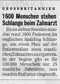 Die positiv motivierte Fortbildung aus der Idee der Verbesserung des eigenen wirtschaftlichen Standpunktes ist die wesentlich wirksamere Strategie. Ich bin sehr stark motiviert, wenn es darum geht meine Konkurrenzfähigkeit zu verbessern. Ich verspüre aber nur negative und destruktive Gefühle, wenn ich zu Zwangsveranstaltungen genötigt werde. Da kommt nichts Positives dabei heraus. Es ist mit unserem Demokratieverständnis nicht vereinbar, wenn "Verbesserungsvorschläge" für unser Gesundheitssystem auf Zwangsmaßnahmen basieren. Schlechte Bezahlung und daraus resultierendes Desinteresse an den betreffenden Behandlungen sind in der Praxis geradezu eine Garantie dafür auch schlechte Leistungen zu erhalten. Niemand läßt sich gerne für dumm verkaufen und an der Nase herumführen. Illustriert wird diese Binsenweisheit zum Beispiel durch den Artikel über die Praxis der Behandlung von kindlichen Frontzahnunfällen in England, den ich aus dem schweizer Zahnarztmagazin "The Dentists Newsletter" entnommen habe, und den ich hier nebenan für Sie abbilde (bitte anklicken). Das Thema "Kindliche Frontzahnunfälle" ist aber nur ein kleines Beispiel von vielen hunderten Themen, die in der Zahnheilkunde wichtig sind. Daß Zwang und Kontrolle langfristig nicht funktionieren hat auch die ehemalig DDR gezeigt. Dort hat man ja versucht ein Zwangs und Vernaderungssystem aufzubauen, bei dem fast jeder jeden kontrollierte. Der Mißerfolg dieses Systems ist allgemein bekannt. |
