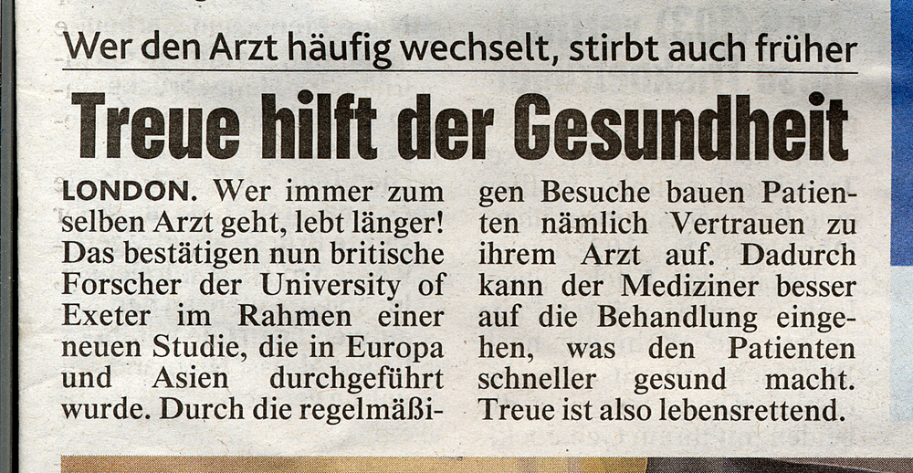 In der Kronenzeitung vom 13. Juli 2018 findet man diese Erwähnung einer aktuellen internationalen Gesundheitsstudie. Viele würden ja gerne ihrem Hausarzt treu sein, wenn sie nur noch einen hätten! In diesen Wochen ist das Aussterben der Hausärzte in der allgemeinen Diskussion. Immer mehr Hausarztstellen, speziell am Land, können nicht mehr nachbesetzt werden,