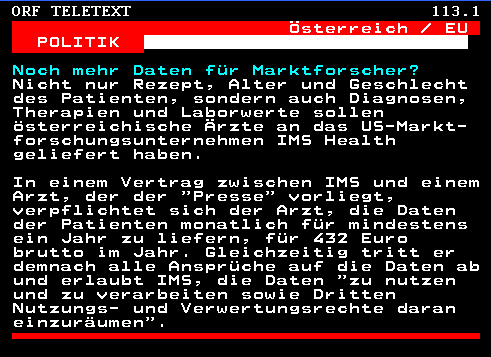 PPS aus dem Jahr 2013: Diese Seite habe ich im Jahr 2011 geschrieben. Heute, am 20.August 2013, finde ich im ORF Teletext folgende Meldung, die den Anfang des Datenhandels dokumentiert, der durch die zwangsweise Einführung von ELGA in Österreich ermöglicht wird. Daran sieht man, daß alles, was denkbar ist, auch in der Praxis umgesetzt wird. Daten, die irgendwo in EDV-Systemen herumliegen, die finden früher oder später den Weg zu Leuten, die am Inhalt dieser Daten interessiert sind. Ob kriminelle Mitarbeiter von EDV Firmen, von Krankenkassen, von Ministerien, von Apothekerkammern oder von Ärztekammern mit diesen Daten ihre Geschäfte machen, das ist eine andere Geschichte. Zu verantworten haben diese Mißstände jene Parteien und Politiker, die diese absolut vorhersehbaren Machenschaften herbeigeführt haben, indem sie die Ärzte zur zwangsweisen Mitarbeit an dem staatlichen Gesundheitsdatensystem ELGA verpflichtet haben. Die damit verbundene Preisgabe des Ärztegeheimnisses stellt einen immensen Schaden für die betroffenen Patienten dar. Man kann deshalb nicht mehr darauf vertrauen, daß sensible Dinge, die man bei der Suche nach Hilfe seinem Arzt anvertrauen will, auch geheim bleiben. So weit hat es unsere Gesundheitspolitik nun gebracht. Die angeblichen Vorteile (vermeiden von Doppelbefunden), mit denen man die Einführung von ELGA begründet hat, die wiegen ganz gering im Vergleich zu dem Vertrauensverlust, den die Aufgabe des Ärztegeheimnisses bedeutet. Doppelbefunde sind für den Patienten auch kein Nachteil, weil oft Patienten selbst wünschen, daß eine Diagnose, die ihnen möglicherweise unangenehm ist, noch einmal bestätigt, oder vielleicht auch widerlegt wird. Wer außer den betroffenen Patienten oder Ärzten sollte deshalb diese Entscheidung treffen? Notfalls würden viele Patienten wohl auch selbst die Kosten für einen Doppelbefund bezahlen. Keinesfalls aber wollen die Betroffenen Patienten die zwangsweise Weitergabe ihrer Befunde an ein landesweites EDV-System mit allen daraus entstehenden Folgen.