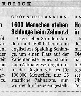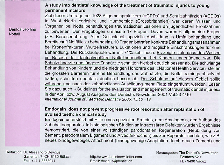 Die positiv motivierte Fortbildung aus der Idee der Verbesserung des eigenen wirtschaftlichen Standpunktes ist die wesentlich wirksamere Strategie. Ich bin sehr stark motiviert, wenn es darum geht meine Konkurrenzfähigkeit zu verbessern. Ich verspüre aber nur negative und destruktive Gefühle, wenn ich zu Zwangsveranstaltungen genötigt werde. Da kommt nichts Positives dabei heraus. Es ist mit unserem Demokratieverständnis nicht vereinbar, wenn "Verbesserungsvorschläge" für unser Gesundheitssystem auf Zwangsmaßnahmen basieren. Schlechte Bezahlung und daraus resultierendes Desinteresse an den betreffenden Behandlungen sind in der Praxis geradezu eine Garantie dafür auch schlechte Leistungen zu erhalten. Niemand läßt sich gerne für dumm verkaufen und an der Nase herumführen. Illustriert wird diese Binsenweisheit zum Beispiel durch den Artikel über die Praxis der Behandlung von kindlichen Frontzahnunfällen in England, den ich aus dem schweizer Zahnarztmagazin "The Dentists Newsletter" entnommen habe, und den ich hier nebenan für Sie abbilde (bitte anklicken). Das Thema "Kindliche Frontzahnunfälle" ist aber nur ein kleines Beispiel von vielen hunderten Themen, die in der Zahnheilkunde wichtig sind. Daß Zwang und Kontrolle langfristig nicht funktionieren hat auch die ehemalig DDR gezeigt. Dort hat man ja versucht ein Zwangs und Vernaderungssystem aufzubauen, bei dem fast jeder jeden kontrollierte. Der Mißerfolg dieses Systems ist allgemein bekannt. |