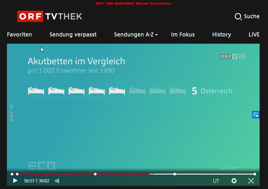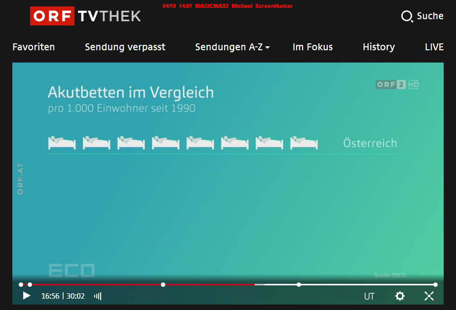 Es gibt auch offizielle Zahlen, die das Schrumpfen unseres Gesundheitssystems dokumentieren. Anläßlich der Coronakrise hat der ORF in der Sendung ECO am 14. April 2020 diese zwei Grafiken gezeigt, mit denen die Anzahl der Akutbetten pro 1000 Einwohnern dargestellt wird.
