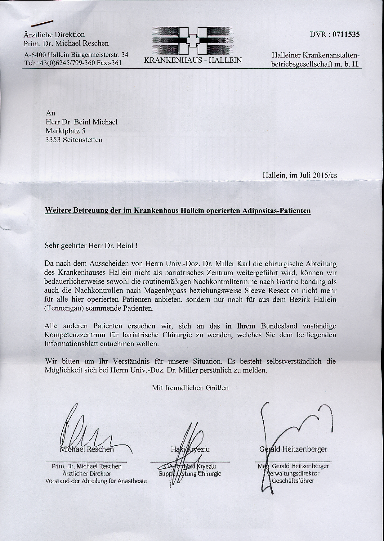 Im Jahr 1998 wurde ich wegen maligner Adipositas von Doz. Karl Miller im KH Hallein am Magen operiert. Seither wurde ich von dem Halleiner Adipositaschirurgiezentrum in liebevoller, aufmerksamer Weise regelmäßig betreut. Meine Arbeitsfähigkeit, meine Gesundheit und meine ganze Lebensqualität verdanke ich der Arbeit des Teams um Doz. Miller. In Hallein habe ich mich stets geborgen und gut aufgehoben gefühlt. Es war ein gewaltiger Schock für mich, als ich im Februar 2015 im KH Hallein anrief um nach drei Jahren wieder einen Kontrolltermin für mich zu vereinbaren. Ich erfuhr nämlich, daß Doz. Miller nicht mehr in diesem Krankenhaus arbeitet und daß es an der chirurgischen Abteilung des KH Hallein überhaupt keinen Arzt für Adipositaschirurgie mehr gibt. Meine Betreuung könne nicht wie seit 17 Jahren gewohnt weiter in Hallein durchgeführt werden. Doz. Miller sei nicht erreichbar und eine andere Möglichkeit oder Person für meine Betreuung sei nicht bekannt. Im Bereich Salzburg gibt es keinen Arzt der bereit ist die Patienten des Adipositaschirurgiezentrums weiter zu betreuen. Das beachtliche Lebenswerk des Dozenten Miller, der Aufbau eines zuverlässigen und vorbildlichen Zentrums für Adipositaschirurgie, wurde hier mit einem Federstrich zunichte gemacht.