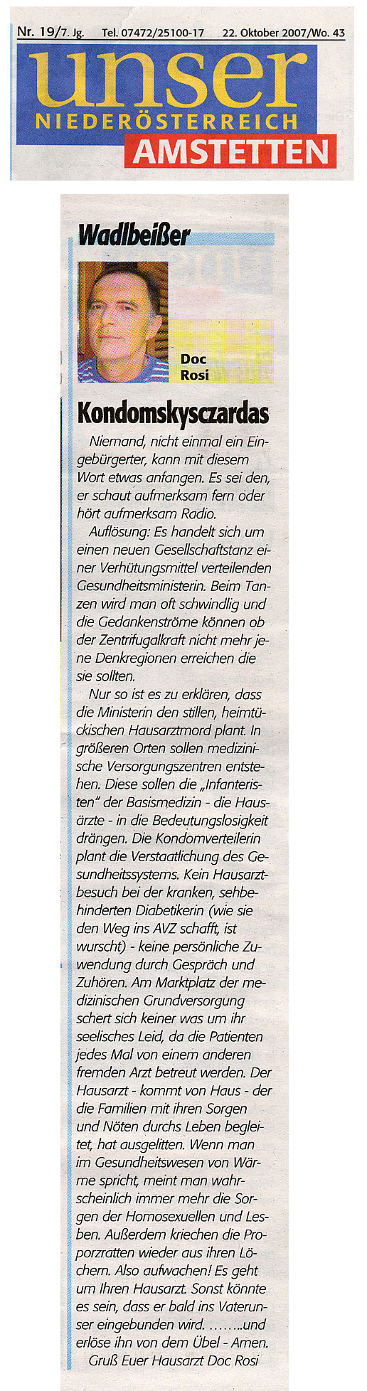 Der schlimmste Höhepunkt in dieser Entwicklung wird nun sichtbar: ausgerechnet eine ÖVP Ministerin im Gesundheitsressort schickt sich an unser seit vielen Jahrzehnten erarbeitetes und bewährtes Gesundheitssystem abzuschaffen und durch eine staatliche Gesundheitsvorsorge in sogenannten ambulanten Versorgungszentren zu ersetzen. Haben wir Österreicher hier den Bock zum Gärtner gemacht? Auf allen Ebenen im Gesundheitssystem laufen seit vielen Jahren die Vorbereitungsarbeiten für dieses Projekt. Mit der Einführung der e-Card für jeden Bürger hat man die organisatorischen Voraussetzungen dafür geschaffen, uns alle in Hinkunft zentral zu verwalten und unsere intimsten Gesundheitsdaten in einem elektronischen Gesundheit