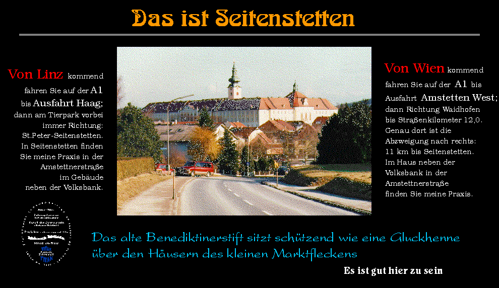 Fahren Sie auf der A1 Richtung Wien bis zur Ausfahrt "Haag"; dann geht es vorbei am haager Tierpark immer in Richtung St.Peter oder Seitenstetten (das ist abwechselnd angeschrieben). St.Peter ist die Ortschaft unmittelbar vor Seitensetten. Die Fahrzeit ab der linzer Stadtgrenze beträgt bei ungestörtem Verkehr etwa 30 Minuten bis Seitenstetten. In Seitenstetten finden Sie an der Hauptstraße (Richtung Amstetten) meine Praxis in dem Haus mit dem schwarzen Steckschild, das einen blauen Knochen zeigt (mein Praxislogo) - gegenüber vom Stift Seitenstetten.
